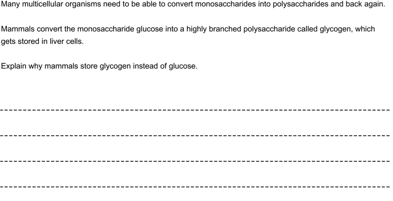 "Glycogen is insoluble, so has no osmotic effect on liver cells – unlike glucose which would draw water into cells and potentially cause them to burst.