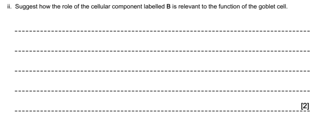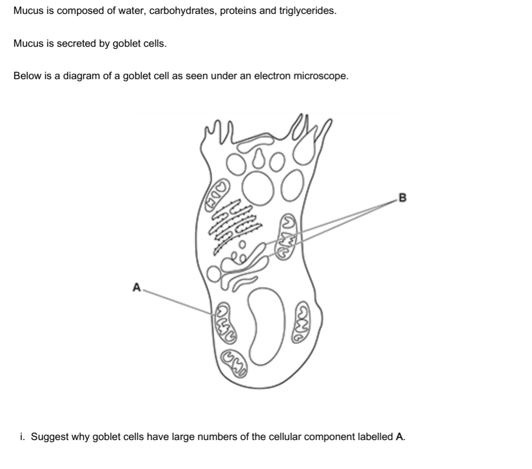 Examiner's comments: Questions linking organelle numbers to cell function are testing whether students can apply their knowledge rather than just recall facts. High-performing candidates explained why large numbers of mitochondria are needed (for energy-demanding processes like active secretion) and identified the Golgi's role in processing and packaging mucus components.