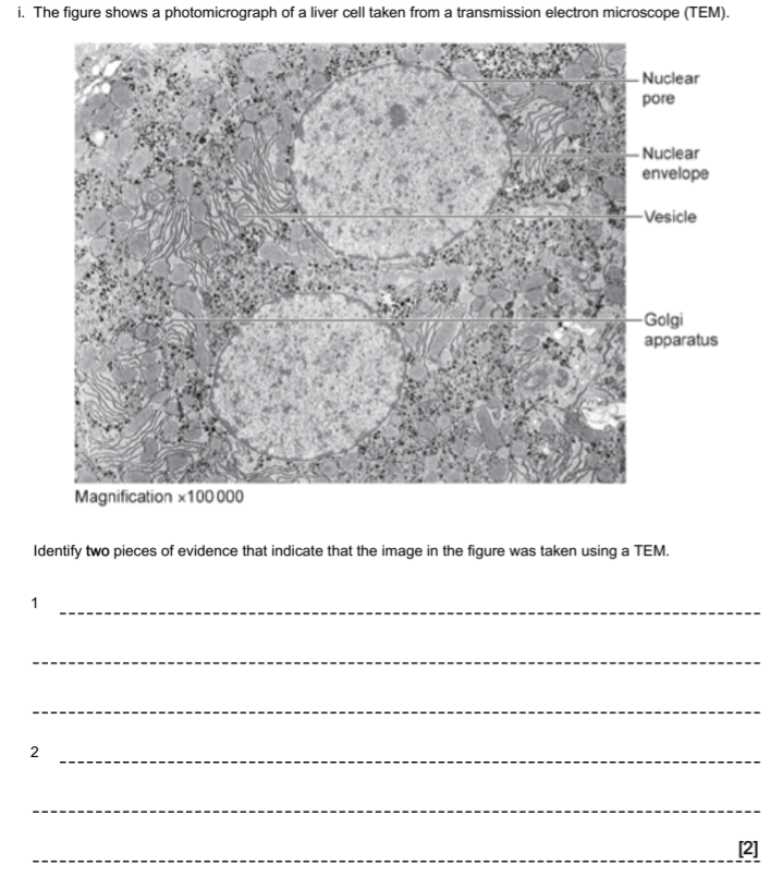 Examiner's comments: "Well answered with most candidates referring to the magnification and the visible organelles as compared to a light microscope. A large proportion of candidates also correctly compared the TEM to a scanning EM with statements about the two-dimensional nature of the figure."