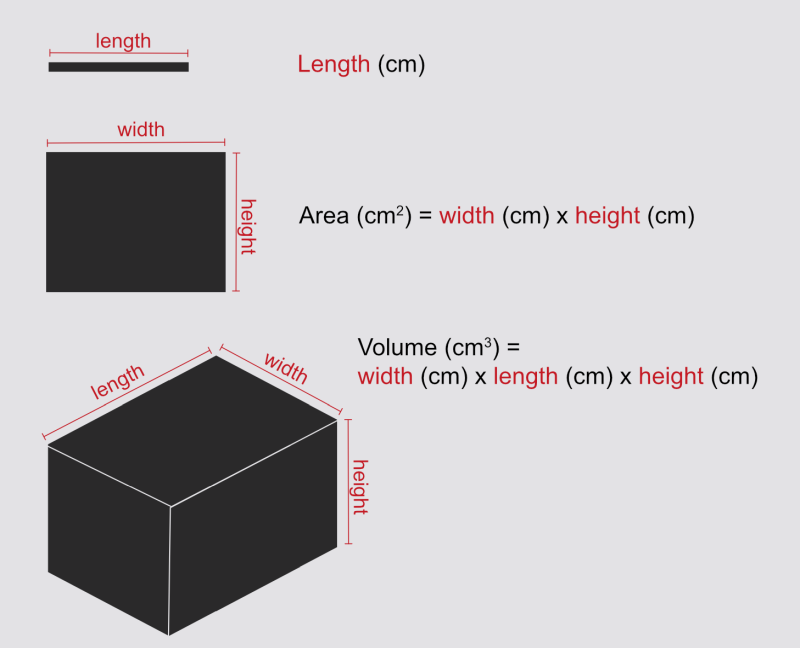 You will need to think about length, area, and volume and understand their units. Here’s a reminder for cuboids: