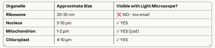 Common Error Why it's wrong Correct answer "Staining makes cells clearer" Too vague "Staining increases contrast between structures" "High magnification gives better resolution" Magnification ≠ resolution "Electron microscopes have higher resolution than light microscopes" "Ribosomes can be seen with light microscope" Too small (20-30 nm) "Ribosomes cannot be seen - below 200 nm resolution limit" "SEM images are 3D" Technically 2D data "SEM produces 2D images of surfaces" (though may appear 3D)